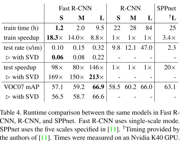 RCNN에 비해서 속도는 학습시간은 9배 정도 향상되었으며 추론시간은 무려 213배 향상되었다고 한다. PASCAL VOC 2007 데이터셋 기준으로 mAP는 66%에서 70% 까지 상승되었다.