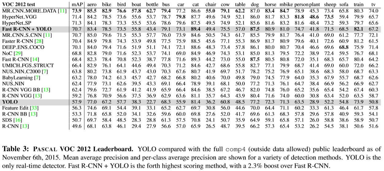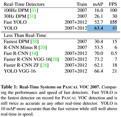 PASCAL VOC 2007과 2012 데이터셋을 합쳐서 학습시킨 결과, YoLo는 63.4% mAP 45FPS를 보여주었다. Two Stage method인 Faster R-CNN이 mAP 73.2%와 7FPS 라는 수치와 비교해보았을때, 정확도는 조금 떨어졌지만 6배가 넘는 FPS 수치를 보여주며 실시간 탐지의 지평을 열게 되었다.