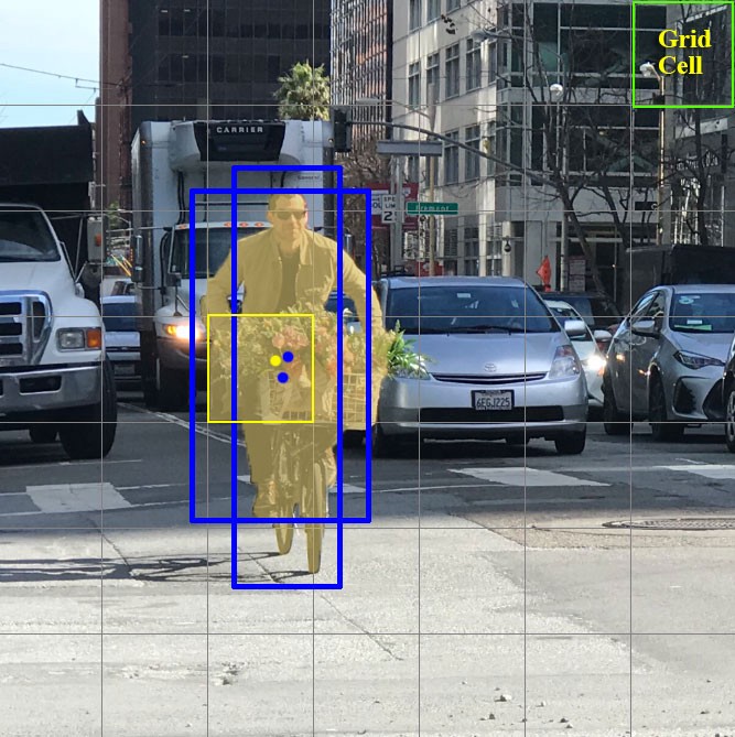 각각의 Grid cell에서는 2개씩 Bouding Box를 예측한다. 아래 그림의 노란색 Box는 Grid cell을 의미한다. 자전거를 타고있는 사람의 예시 사진을 통해 자세히 알아보자.