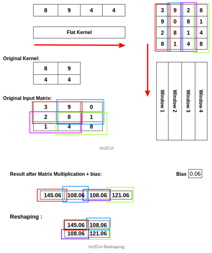 Input 행렬에 대해서 Weight와 겹치는(Overlap)되는 영역의 윈도우에 대해서 열백터로 만들어준다. 그림에서 보면 첫번째로 겹치는 빨간색 행렬인 `[[3, 9], [2, 8]]`이 열벡터로 reshape되어 `[[3], [9], [2], [8]]`이 되어 Window1을 생성한다. 두번째로 겹치는 파란색 행렬인 `[[9, 0], [8, 1]]`이 열벡터로 reshape되어 Window1 오른쪽에 붙게된다. 이때 행렬의 형태는 `[[3, 9], [9, 0], [2, 8], [8, 1]]` 이 된다.