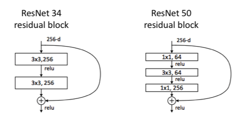 ResNet-34와 ResNet-50에서의 Block구조이다. ResNet-34에서의 Block은 2개의 Conv Layer가 들어가있으며 Parameter의 수는 3x3x256x256+3x3x256x256 = 39.3216M 이 된다.