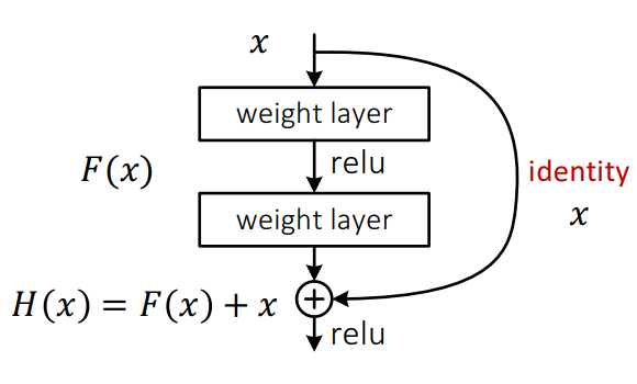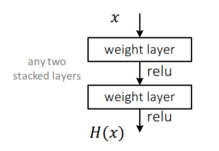 위 그림은 일반적인 CNN의 구조이다. 입력으로 들어온 $x$가 weight layer(Conv layer와 동치)를 지나가고 활성함수 relu를 통과하는 형태이다. 우리는 이렇게 통과하고 나온 최종적인 형태인 $H(x)$를 최적화 하는것을 목표로 삼는다.