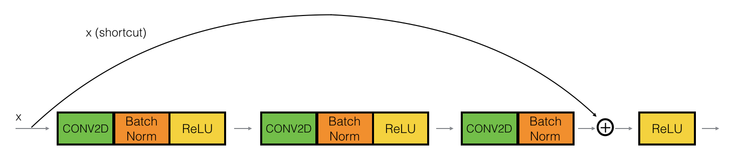 맨위 그림의 보라색 영역을 살펴보면, 첫번째 Block에서 FeatureMap의 형상이 (28, 28, 64) 였다면 세번째 Block의 마지막 Conv Layer를 통과하고 Identity Mapping까지 완료된 FeatureMap의 형상도 (28, 28, 64)이다.