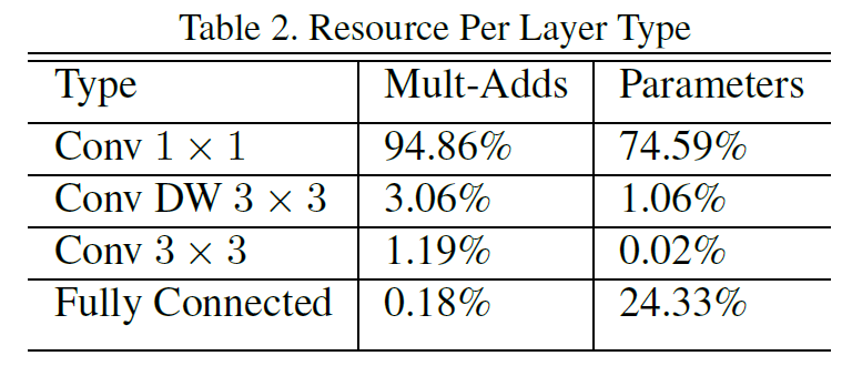 얼핏봐도 약 9배정도의 연산량이 감소한것을 확인할 수 있다!! v1에서는 일반 Convolution과 Depthwise Separable Convolution을 비교 테스트 하였을때 약 1%가량 정확도 손실이 있다고 밝혔다. 하지만 연산량과 정확도 사이의 Trade-Off를 비교해보면 Depthwise Separable Convolution을 사용하는것이 엄청난 이득임을 알 수 있으며, EfficientNet은 이 방법을 차용하고 있으면서 아직까지도 SOTA의 반열에 있다.