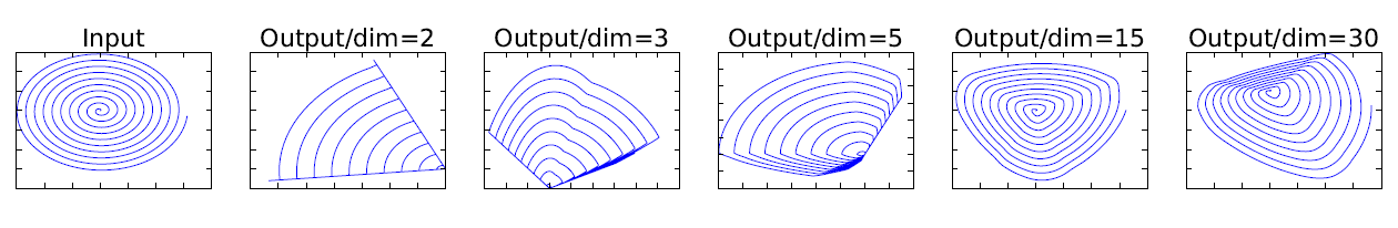 위 그림의 Input은 n차원 공간에서의 나선형 배열을 좌표계에 그림이다. 그리고 오른쪽에 나열되어있는 그림들은 특정 dim으로 차원축소를 한 후 ReLU를 적용 후 다시 n차원 공간으로 복원시킨것이다. 2-dim에서 ReLU를 적용한것은 엄청나게 정보손실이 잃어났음을 알 수 있다. 반면 30-dim에서 ReuLU를 적용한것은 완벽하지는 않지만 Input과 유사한 그림을 그려낸것을 확인할 수 있다.