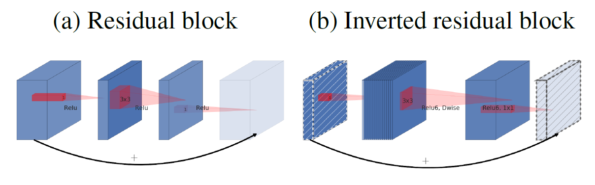 v2에서는 이러한 문제를 해결하기위해서 Inverted Residual Block이라는 방법을 도입한다. ResNet에서 사용된 Residual Block을 잠시 떠올려보면 FeatureMap의 채널을 Pointwise Convolution을 통해 축소시킨 후 3x3 Convolution을 통해 FeatureMap을 추출하고 다시 Pointwise Convolution을 통해 채널을 확장시킨다(순서: 확장 -> 축소 -> 확장). v2에서는 v1에서 사용한 Depthwise Separable Convolution을 그대로 계승하며 Residual Block의 과정을 완전히 반대로 수행한다(순서: 축소 -> 확장 -> 축소).