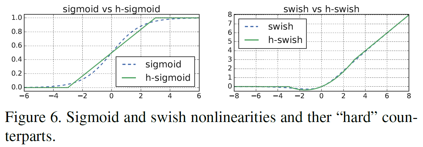 변경후 정확도에 향상을 보여주었으나 모바일 환경을 고려해보면 Sigmoid 연산을 하는것은 매우 연산비용이 높다는 단점이 있다. 그래서 해당 Sigmoid를 ReLU로 대채하여 swish에 매우 근사한 Hard-Swish를 사용한다.