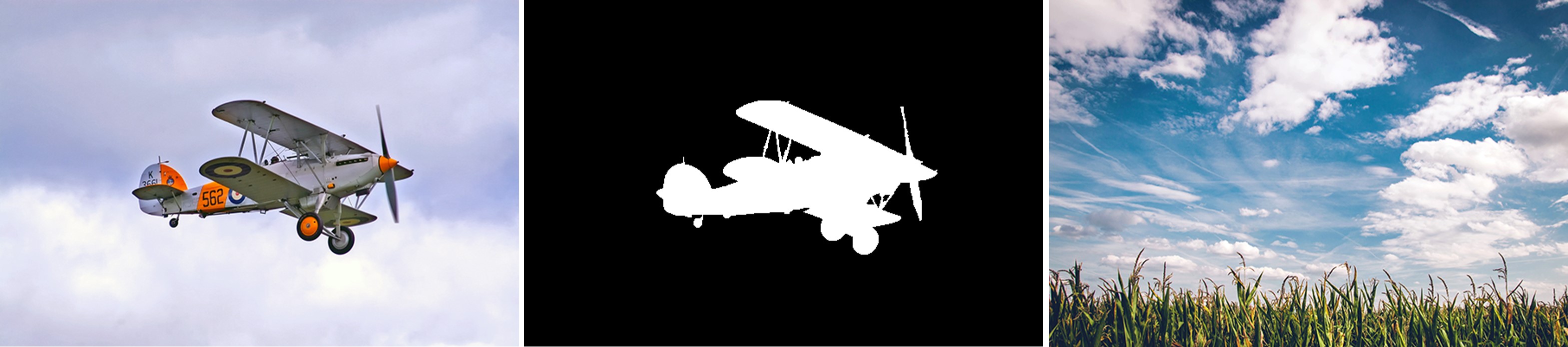 OpenCV에서는 원본이미지, Mask이미지 두장의 이미지를 활용하여 합성을 할 수 있다. 아래 이미지에서 비행기에 해당하는 부분을 오른쪽 하늘에 합성하는 예제를 보도록 한다.